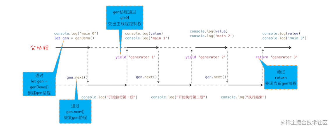 - 然后在父协程中通过执行 gen.next 把主线程的控制权交给 gen 协程。