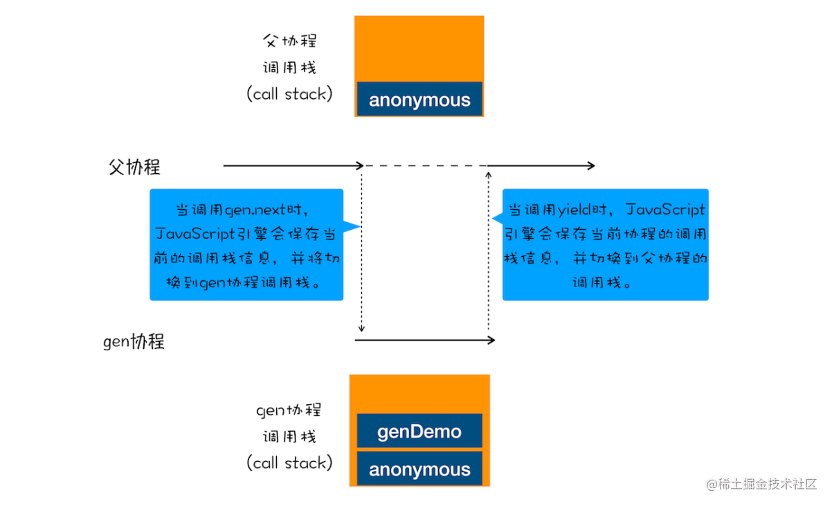 第二点:当在 gen 协程中调用了 yield 方法时,JavaScript 引擎会保存 gen 协程当前的调用栈信息,并恢复父协程的调用栈信息。同样,当在父协程中执行 gen.next 时,JavaScript 引擎会保存父协程的调用栈信息,并恢复 gen 协程的调用栈信息。为了直观理解父协程和 gen 协程是如何切换调用栈的,你可以参考下图: