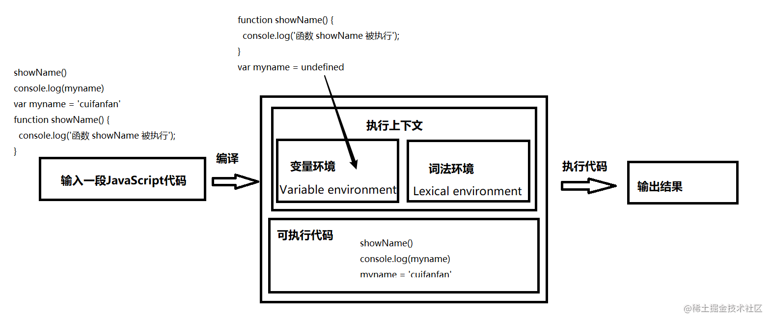 一段JavaScript 代码在执行之前需要被 JavaScript 引擎编译,编译完成之后,才会进入执行阶段。