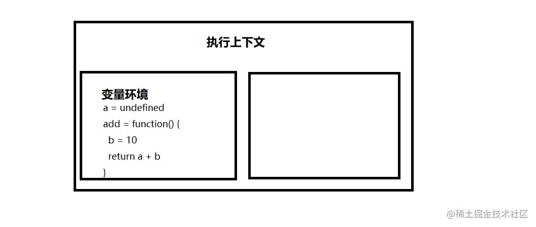 接下来,第二步继续执行代码,当执行到代码块里面时,变量环境中 a 的值已经被设置成了 1,词法环境中 b 的值已经被设置成了 2,这时候函数的执行上下文就如下图所示: