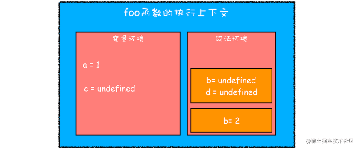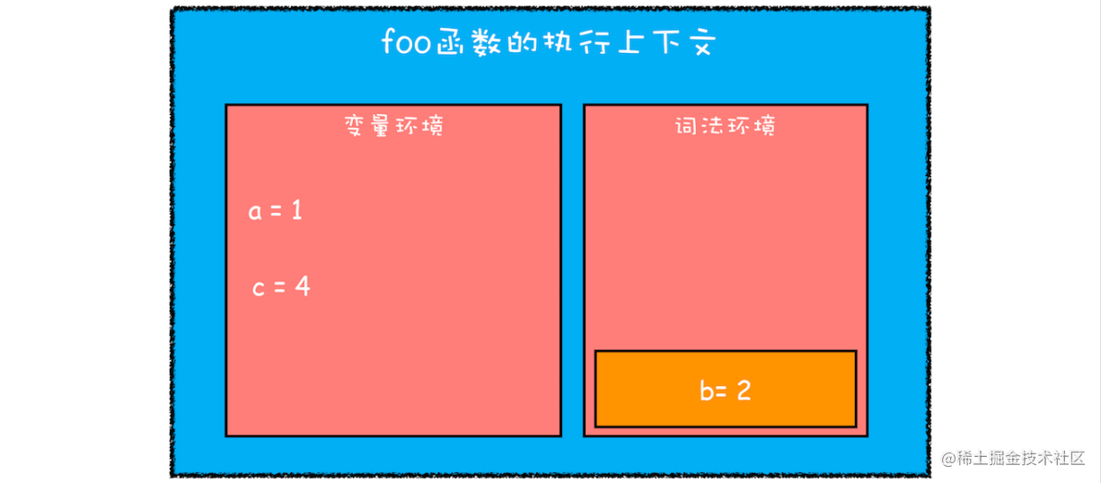 接下来,第二步继续执行代码,当执行到代码块里面时,变量环境中 a 的值已经被设置成了 1,词法环境中 b 的值已经被设置成了 2,这时候函数的执行上下文就如下图所示: