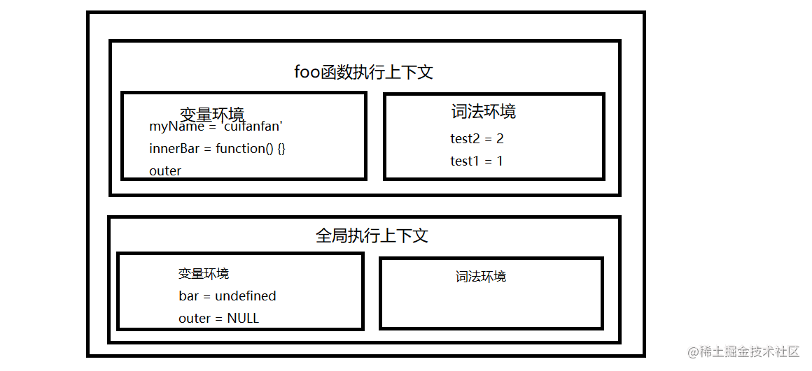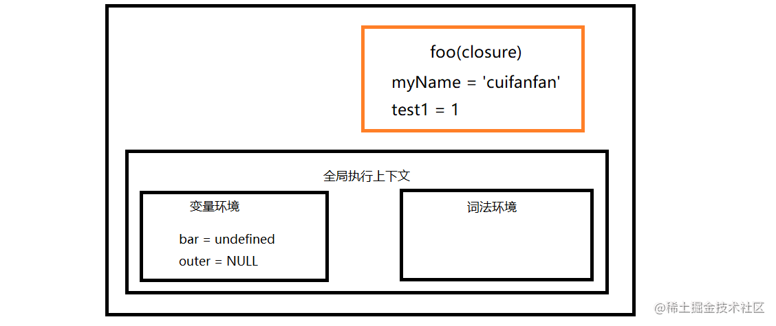 当作用域块执行结束之后,其内部定义的变量就会从词法环境的栈顶弹出,最终执行上下文如下图所示: