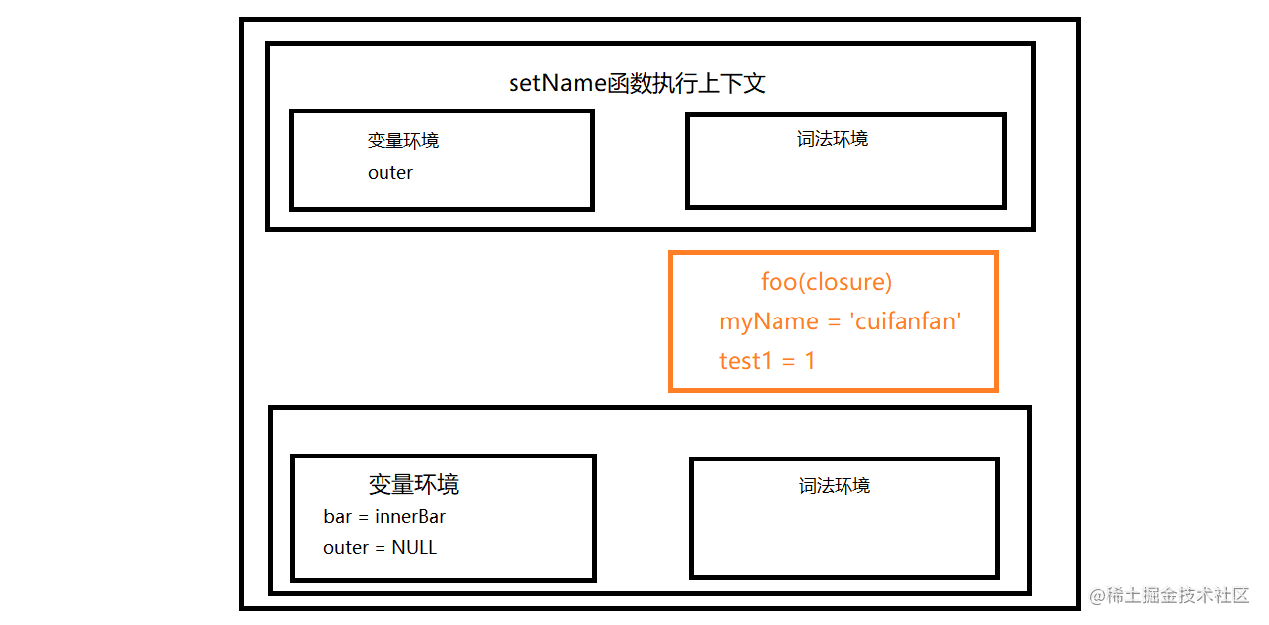 根据词法作用域的规则,内部函数 getName 和 setName 总是可以访问它们的外部函数foo 中的变量,所以当 innerBar 对象返回给全局变量 bar 时,虽然 foo 函数已经执行结束,但是 getName 和 setName 函数依然可以使用 foo 函数中的变量 myName 和test1。所以当 foo 函数执行完成之后,其整个调用栈的状态如下图所示:
