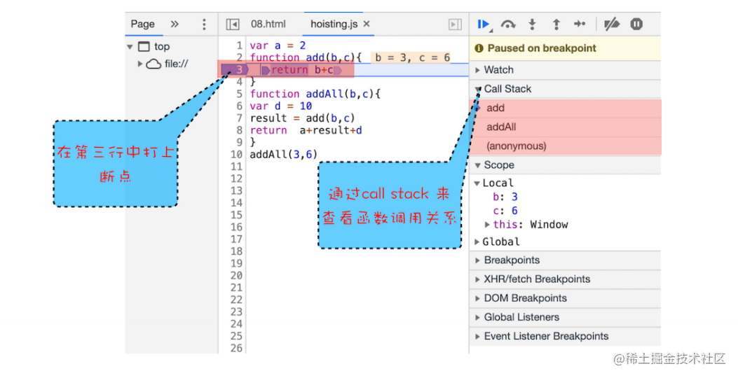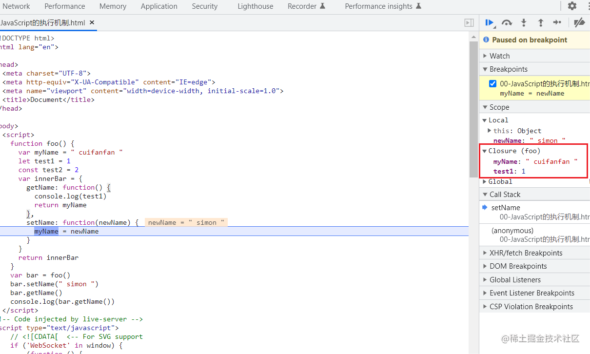 从图中可以看出来,当调用 bar.getName 的时候,右边 Scope 项就体现出了作用域链的情况:Local 就是当前的 getName 函数的作用域,Closure(foo) 是指 foo 函数的闭包,最下面的 Global 就是指全局作用域,从“Local–>Closure(foo)–>Global”就是一个完整的作用域链。