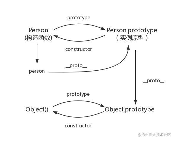 其实原型对象就是通过 Object 构造函数生成的,结合之前所讲,实例的 proto 指向构造函数的 prototype ,所以我们再更新下关系图: