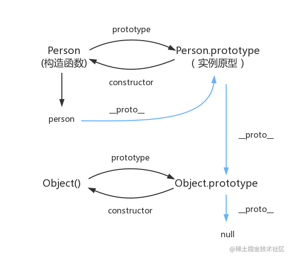 当获取 person.constructor 时,其实 person 中并没有 constructor 属性,当不能读取到constructor 属性时,会从 person 的原型也就是 Person.prototype 中读取,正好原型中有该属性,所以: